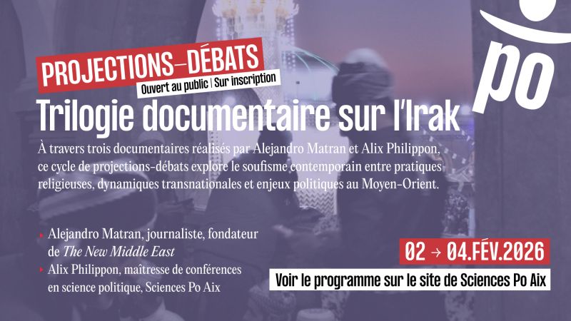 Dans le cadre de l’axe 3 « Religion et politique dans le monde contemporain« , Alejandro Matran et Alix Philippon présentent leur trilogie documentaire sur l’Irak. Chaque diffusion est suivie d’une présentation des travaux de recherche d’Alix Philippon et d’un débat avec la salle.